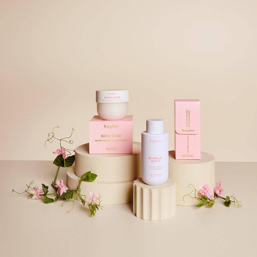 Relax and unwind with this rich, luxurious bubble bath. Our aromatic and generously foaming formula will leave skin cleansed and subtly fragranced with a delicate blend of white peonies and cashmere.
