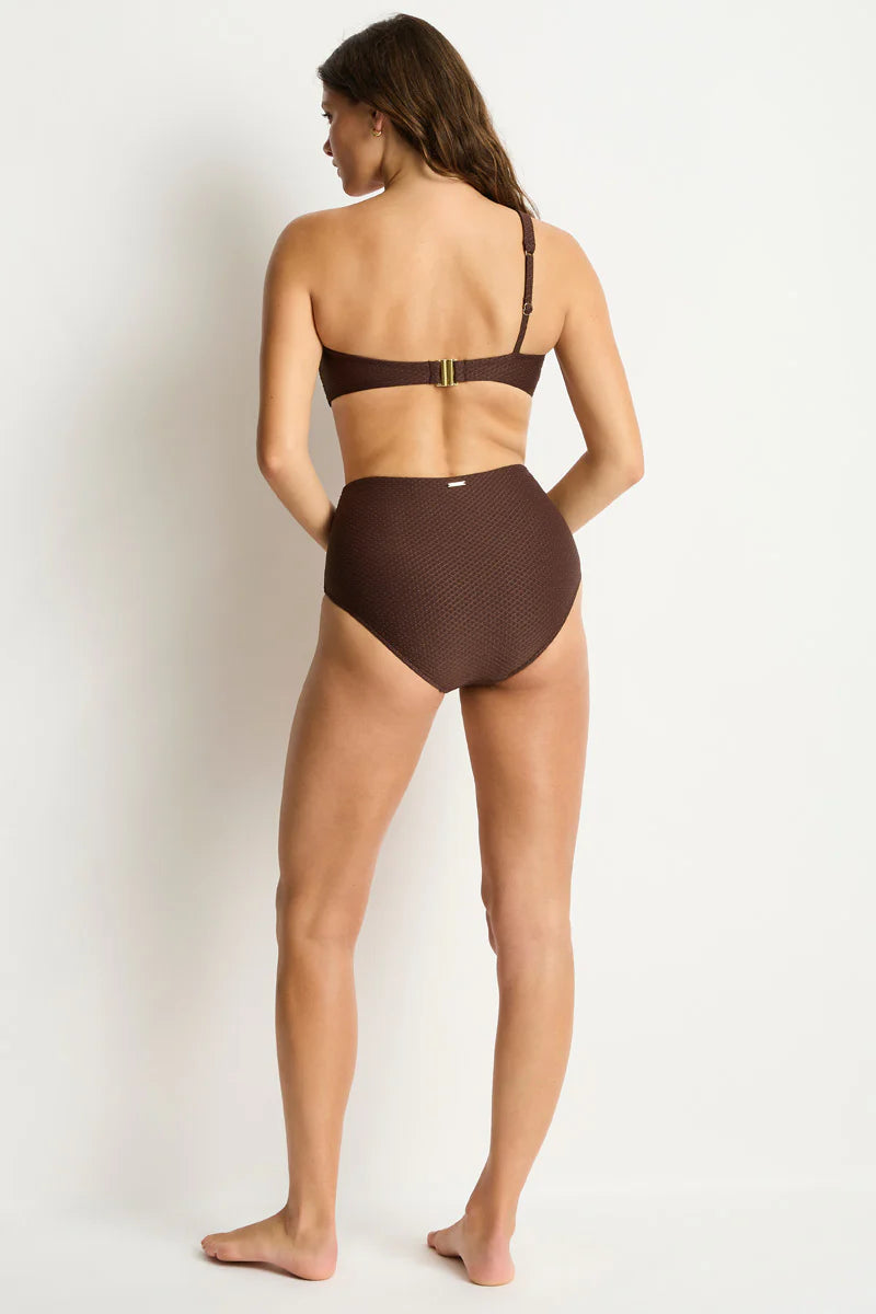 Crafted from a softly textured lycra and over 70% recycled materials, each piece is interwoven with a lurex thread, creating a soft, radiant glimmer that catches the light with every movement. Luminara features gold hardware details in the form of gleaming gold chains and rings, while the eclectic cuts and playful proportions bring a refreshing twist to sustainable swimwear.